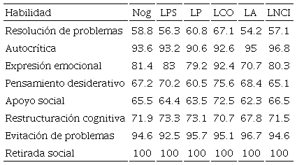La Tabla 7 expone los resultados de los indicadores de la presencia de habilidades de afrontamiento en los estudiantes, tanto a nivel global como por carrera. A título informativo, las ocho estrategias de afrontamiento presentadas diferencian un estilo de afrontamiento activo o dirigidas a la acción, tales como resolución de problemas, reestructuración cognitiva, expresión emocional y apoyo social, en contraste con las estrategias de afrontamiento pasivo, no dirigidas a la acción, tales como evitación de problemas, pensamiento desiderativo, autocrítica, y retirada social. Se observa en los resultados que las mayores prevalencias se encuentran en aquellas habilidades de afrontamiento pasivo, en todas las carreras, siendo la habilidad de resolución de problemas (habilidad de afrontamiento orientada a la acción) la que presenta menor prevalencia tanto a nivel global como por carrera.