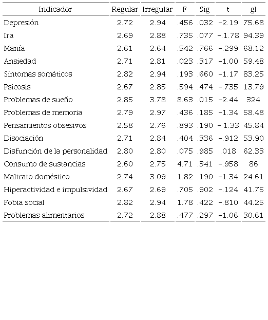 Las Tablas 8 y 9 presentan los resultados del estadístico T de Student, con relación a la diferencia de medias, para determinar si existen o no diferencias entre los indicadores de salud mental y habilidades de afrontamiento con el rendimiento académico. Se observa en la Tabla 8, con relación a los indicadores de salud mental, que solo los indicadores de depresión y problemas de sueño presentan diferencias significativas entre el grupo de alumnos regulares e irregulares, siendo el grupo de alumnos irregulares el de mayor problemática en los indicadores antes mencionados.