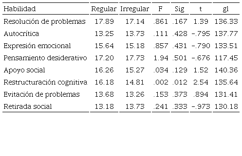 La Tabla 9 presenta la diferencia de medias de los indicadores de afrontamiento, solo la habilidad de restructuración cognitiva presentó una diferencia significativa, siendo el grupo de alumnos regulares el que mayor presencia tiene de la habilidad de desarrollo de esta estrategia cognitiva para modificar el significado de la situación estresante.