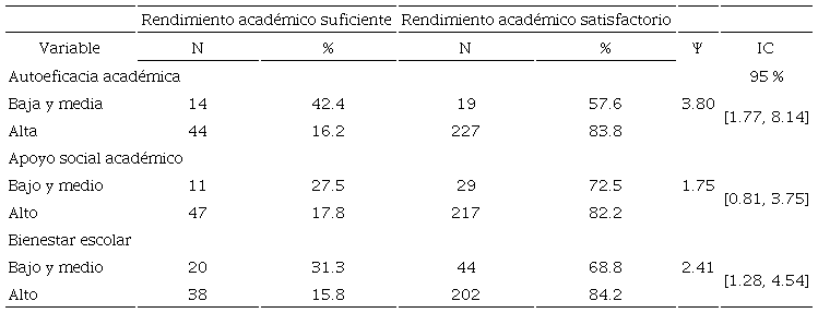 Resumen: El objetivo de este estudio es identificar la relación de la autoeficacia académica, el apoyo social académico y el bienestar escolar con el rendimiento académico, además de comparar estas variables por sexo. Se realizó un estudio cuantitativo, correlacional y transversal en el que se aplicaron la Escala de Autoeficacia en Conductas Académicas, la Escala de Apoyo Social Académico y la Escala de Bienestar en Contexto Académico. Con base en un muestreo no probabilístico de conveniencia participaron 304 estudiantes de licenciatura de una universidad del occidente de México, 175 mujeres y 129 hombres con una media de edad de 20.82 (DE = 2.46) y 21.02 (DE = 3.10), respectivamente. La autoeficacia académica, el apoyo social académico y el bienestar escolar correlacionaron significativamente con el rendimiento académico y se identificó que es menos probable lograr un rendimiento académico satisfactorio cuando se cuenta con una autoeficacia académica baja y media. Las mujeres tienen un mejor rendimiento académico y un mayor bienestar escolar con relación a los hombres. La relevancia de este estudio radica en que muestra la factibilidad para realizar intervenciones que propicien el desarrollo de la autoeficacia en estudiantes universitarios en la modalidad semipresencial.