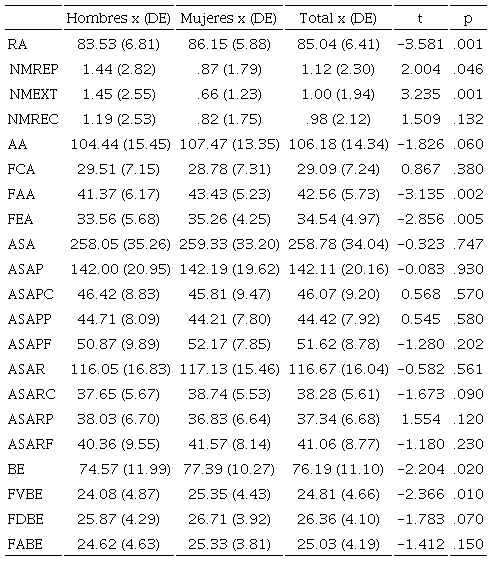 Con respecto a la comparación por sexo, destaca que las mujeres tienen un mejor RA que los hombres (t = -3.581, p = .001). De igual forma se identifican diferencias estadísticamente significativas en el FAA (t = -3.135, p = .002) y en el FEA (t = -2.856, p = .005), siendo las mujeres quienes tienen mayores puntajes (Tabla 3). En cuanto al ASA, no se identifican diferencias estadísticamente significativas, y con relación al BE, las mujeres tienen un mayor puntaje (t = -2.204, p = .02).