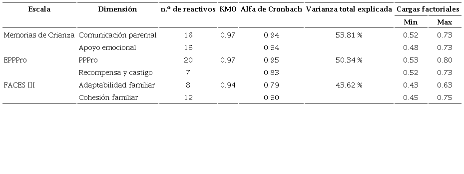 Propiedades psicométricas para las escalas memorias de crianza, prácticas parentales prosociales y FACES III