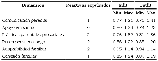 Los reactivos expulsados en la dimensión de adaptabilidad familiar fueron “Padres e hijos se ponen de acuerdo en relación con los castigos” y “Nos gusta convivir solamente con los familiares más cercanos”, pues los valores de infit fueron de 1.59 y 1.61 respectivamente.