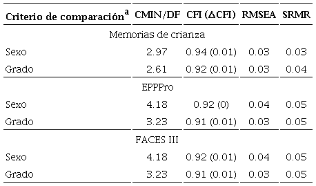 Con relación al análisis de invarianza, las diferencias entre los valores no se deberían encontrar mayor o menor de 0.1 en CFI; para RMSEA y SRMR, no mayor de 0.01 (Domínguez y Adrián, 2015; Ochoa et al., 2015).