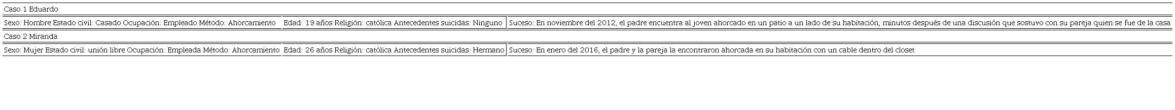 Caso 2. Miranda se suicidó cuatro años después que su hermano, tenía 26, vivía con sus padres y con su pareja en unión libre, tenían poco más de un año de relación. La madre refirió que la relación de la familia con la pareja de su hija era buena, ya que él era una persona que ayudaba con las labores del hogar y ella lo veía como un hijo más.