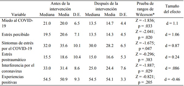 Considerando los resultados presentados, puede observarse que al principio del taller los participantes presentaban un nivel medio de miedo y estrés hacia el COVID-19, y al finalizarlo, el grupo en promedio presentó niveles bajos de ambos. Los valores de significancia estadística unilateral y los tamaños del efecto estimados respaldan los resultados satisfactorios (tabla 1).