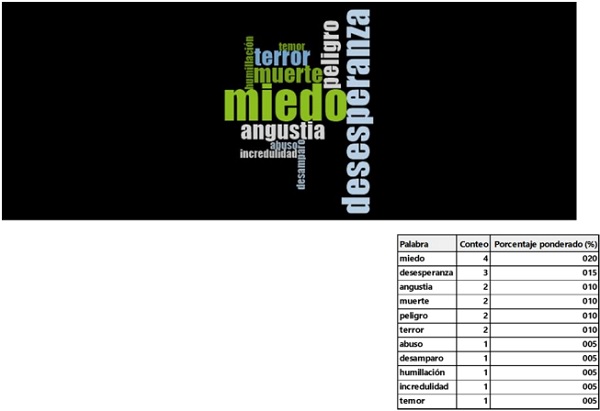 Como puede observarse, la palabra miedo es la que presenta mayor conteo y porcentaje ponderado. Así mismo, todas las palabras, a excepción de la palabra incertidumbre, enfatizan sentimientos o emociones determinantes de condiciones desfavorables para la reproducción de factores psicosociales de protección y de salutogénesis (Antonovsky, 1988; Lindström y Eriksson, 2011) y activos para la salud.