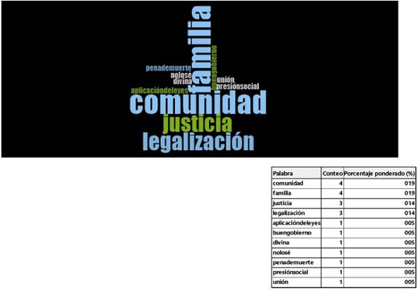 Al término de las entrevistas, a manera de cierre, se le pidió a cada uno de los participantes que enunciara, en una palabra, sentimientos o emociones vinculados a la narcoviolencia. Además, se les solicitó que expresaran cuál podría ser un apoyo importante para hacer frente a la narcoviolencia. A continuación, de forma gráfica, se exponen en el orden respectivo los resultados alcanzados (ver Fig. 1).