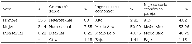 El estudio se conformó por 353 encuestados, con un rango de edad entre los 18 a 57 años, con una media de 29 años. El mayor porcentaje de personas encuestadas fue de sexo femenino (84.19 %), con un 15.29 % de población masculina y solo el 0.28 % reportó ser intersexual. Respecto a la orientación sexual, el 83 % respondió ser heterosexual, el 7.64 %, homosexual, el 8.21 %, bisexual y el 1.13 %, otro. Dentro de las características poblacionales, se observó una autopercepción de clase económica alta con el 2.83 %, media alta con el 50.99 %, siendo este grupo el de mayor porcentaje, seguido por media baja con 44.76% y de clase baja con el 1.42 %. En cuanto al tiempo de relación, se obtuvo una media de 12.87 DE 16.57 años de relación con un rango de uno y máximo de 51. Solo el 6.51 % se encuentra en una relación a distancia. Finalmente, del total de encuestados, el 94.05 % reportó tener una vida sexual activa y el 5.94 reportó no tener actividad sexual.