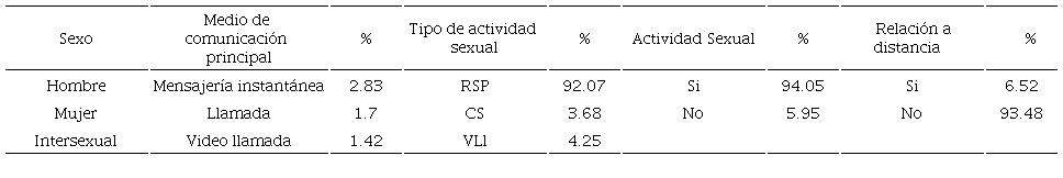 En la Tabla 2. Se reportan las variables relacionadas a las formas de comunicación, así como el tipo de relación erótica con la pareja, en la que se destaca que la muestra reporta que tiene relaciones de ciber sexo 3.65% de las personas (96.35% no), 94 % tienen actividades sexuales (6% no las tiene) y 6.5 % cuentan con una relación a distancia, es importante señalar que se puede clasificar como actividades sexuales también las no presenciales (cibersexo).