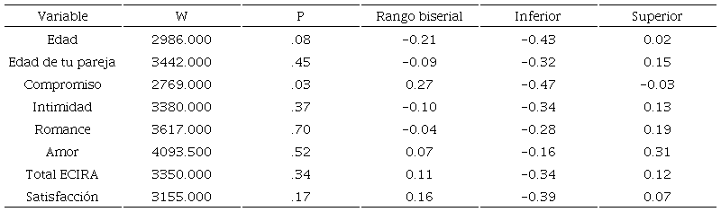 En la Tabla 5, se muestra que únicamente se encuentra diferencia significativa en el total de compromiso con un tamaño del efecto bajo (cercano a medio), lo cual implica que la diferencia entre las relaciones digitales y presenciales se encuentra en el compromiso. Otro hallazgo importante es que, en la comparativa por sexos, los hombres presentan como diferencia significativa con las mujeres puntajes más bajos en compromiso (W = 2768.5, p = 0.031, Hodges-Lehmann = -3, I. C. bajo -5, alto 1; rango biserial = -0.26).