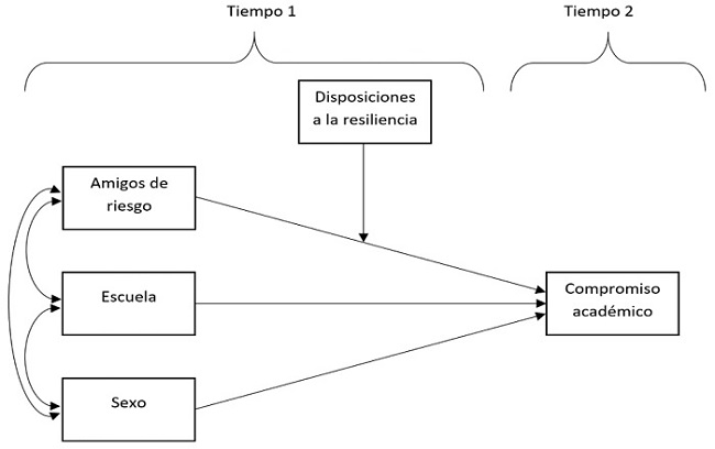 H2: Las disposiciones a la resiliencia en T1 moderarán la relación negativa de las amistades con conductas de riesgo y el compromiso académico en T2.
