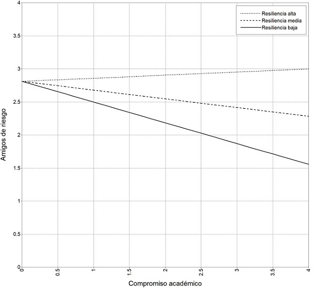 En otras palabras, sin el papel protector y moderador de las disposiciones a la resiliencia, el efecto de tener amigos de riesgo en el compromiso académico tiene el efecto negativo completo que se describió previamente. Cuando un estudiante posee niveles medios de disposiciones a la resiliencia, tener amigos de riesgo tiene un efecto menor, aunque significativo, en el compromiso académico. Finalmente, en estudiantes con altos niveles de disposiciones a la resiliencia, el compromiso académico no es afectado por los amigos con tendencia al riesgo. La Figura 2 muestra visualmente los resultados del análisis de moderación.
