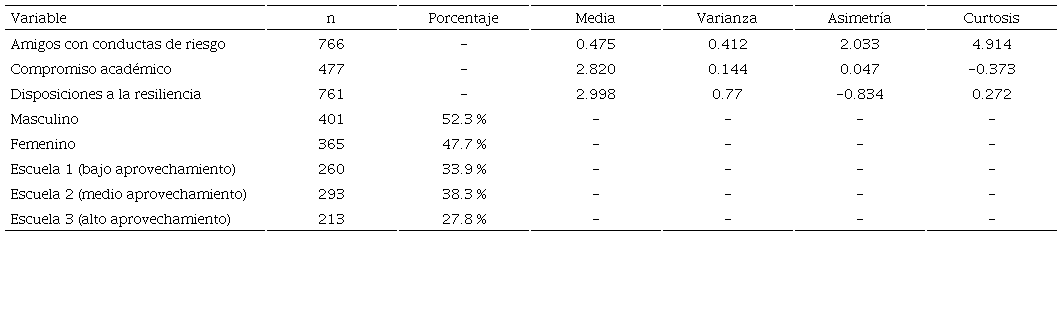 Las características de los participantes se describen en la Tabla 1. Las medias se calcularon promediando los reactivos que se retuvieron tras realizar los análisis factoriales confirmatorios. Puede notarse que la escala de amigos de riesgo arrojó la distribución menos normal, donde una gran cantidad de estudiantes reportan puntajes bajos y se presenta una cola a la derecha de la escala. La distribución de los puntajes de disposiciones a la resiliencia está ligeramente concentrada a la derecha de la escala con una cola hacia la izquierda.