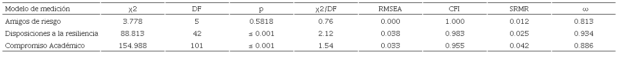 Los resultados de los análisis factoriales confirmatorios se presentan en la Tabla 2. Estos indican que la configuración final de los instrumentos tuvo un excelente ajuste. El modelo para la escala de amigos de riesgos constó de cinco indicadores en una estructura unifactorial. El modelo para la escala de disposiciones a la resiliencia constó de 11 indicadores en una estructura de dos factores, el de disposiciones instrumentales y disposiciones emocionales, cargando en un factor de segundo orden de disposiciones a la resiliencia. El modelo para la escala de compromiso académico constó de 16 indicadores en una estructura de tres factores: el de compromiso emocional, conductual y cognitivo; cargando en un factor de segundo orden de compromiso académico. El coeficiente omega (ω) para escalas de peso unitario indica buena confiabilidad para todas las escalas.