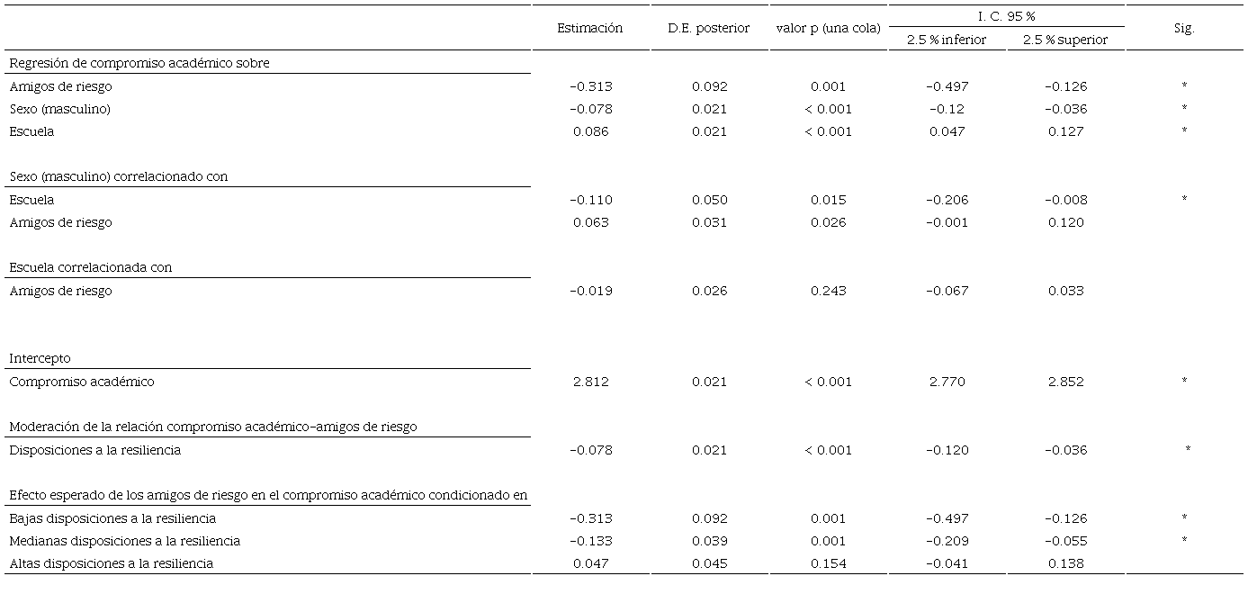 Con relación a las otras variables del modelo, se encontró que pertenecer a una escuela de mayor rendimiento se asociaba a mayor compromiso académico, con un coeficiente estandarizado de β = 0.225 (p < 0.001, I. C. 95 % [0.124, 0.324]). Respecto al sexo, se encontró que ser de sexo masculino predecía menor compromiso académico, con un coeficiente estandarizado de β = -0.205 (p < 0.001, I. C. 95% [-0.305, -0.096]). Aunado a esto, el sexo masculino correlacionó negativamente con pertenecer a una escuela de mayor rendimiento académico (r = -0.110, p = 0.015, I. C. 95% [-0.206, -0.008]), lo que indica que en escuelas de mayor rendimiento hay menos proporción de estudiantes de sexo masculino. También, se encontró que los estudiantes de sexo masculino tienen ligeramente mayores puntuaciones en la escala de amigos de riesgo (r = 0.097, p = 0.026, I. C. 95 % [-0.002, 0.184]). Por último, puede observarse que el modelo tiene un ajuste excelente (PPP = 0.490).