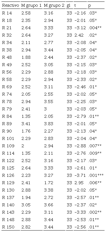 Con el fin de evaluar el poder discriminativo de cada uno de los 150 reactivos, se aplicó la prueba t de Student para muestras independientes (Hernández Sampieri et al., 2014; Pick y López, 1994). Dicha prueba, adecuada para instrumentos a nivel intervalar, permitió evidenciar si los universitarios con mayor RSU (25 % de la muestra que obtuvieron puntajes superiores en el puntaje total de la escala) mostraban diferencias estadísticamente significativas en el modo de responder a cada uno de los reactivos en comparación con los universitarios con menor RSU (25 % de la muestra con puntajes inferiores en el puntaje total). El resultado de esta prueba constituyó el principal criterio para seleccionar los reactivos que se aplicarían en la segunda fase del estudio. Se observó que, de los 150 reactivos originalmente propuestos, 30 de ellos obtuvieron probabilidades menores a .05, tal como se muestra en la Tabla 1.