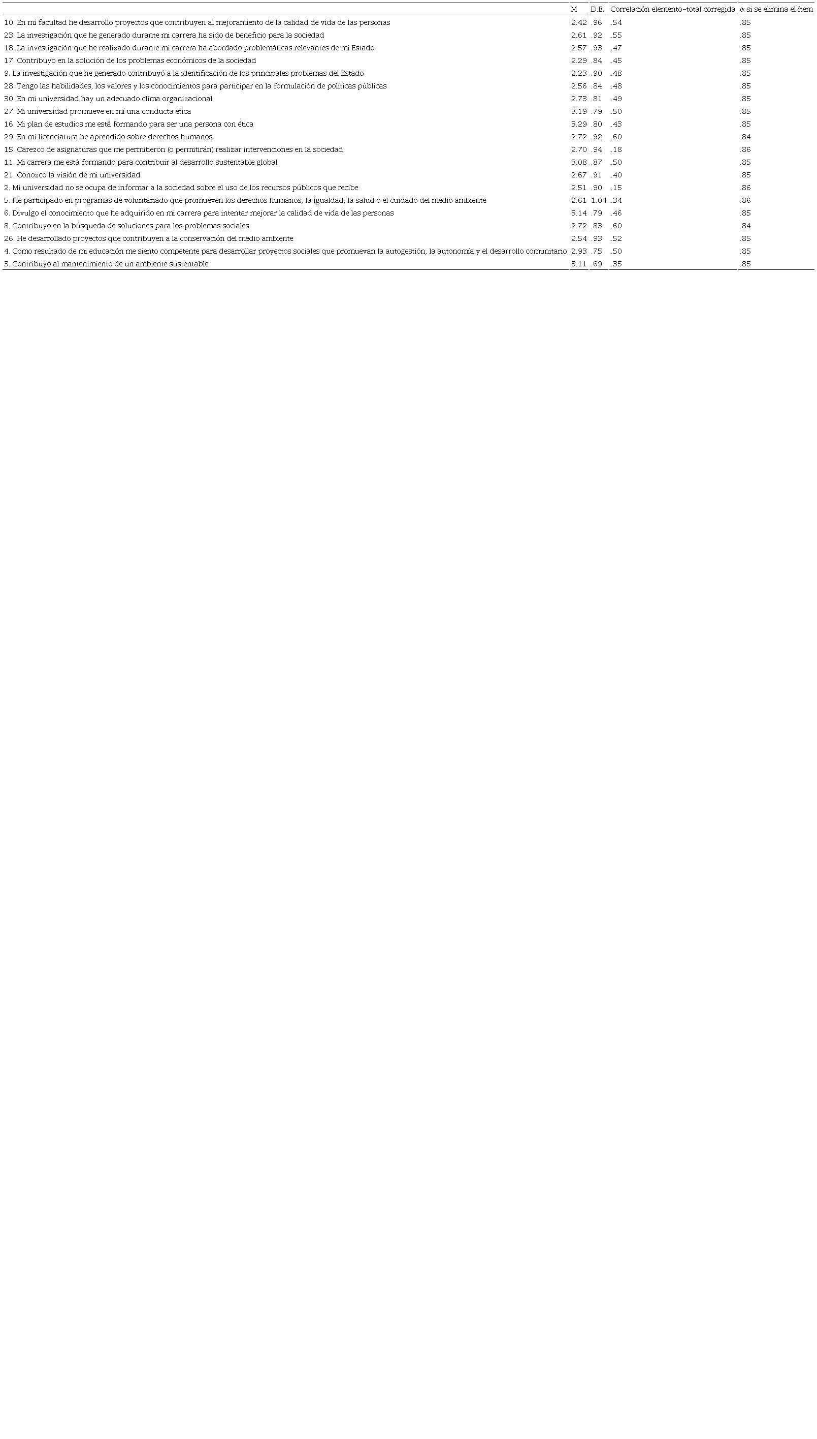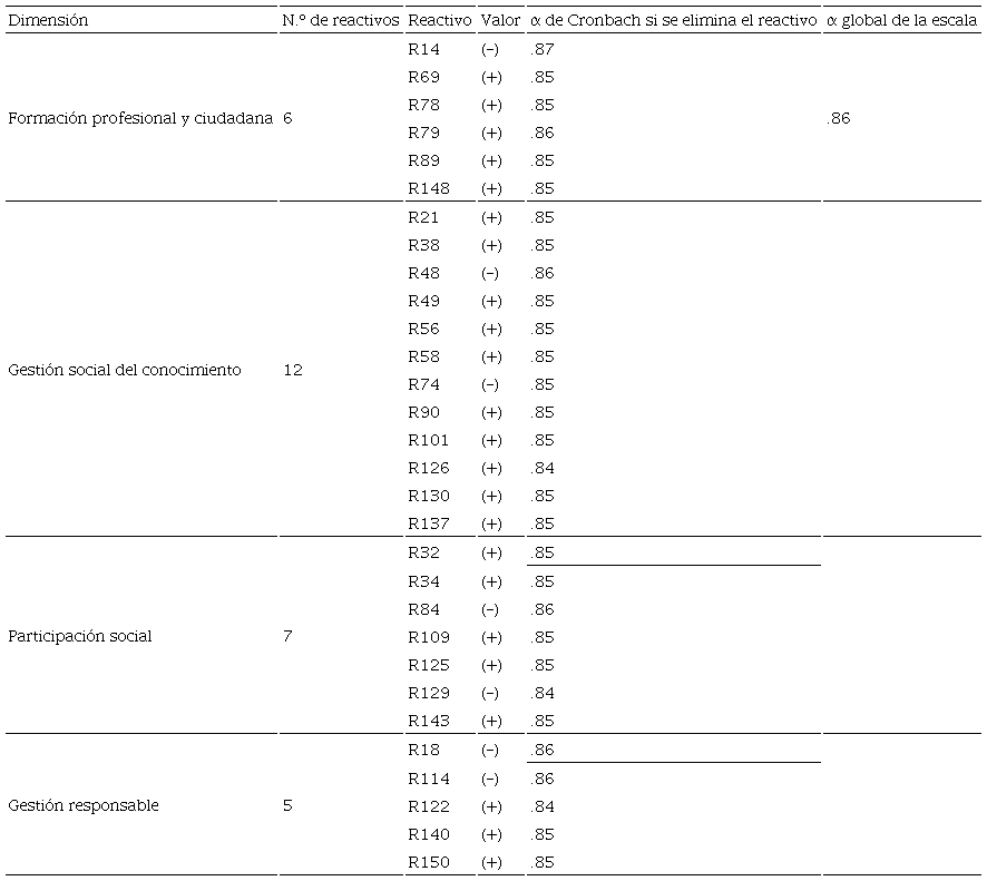 A partir de los resultados anteriores, se observó la reducción de la extensión de la escala (de 150 a 30 reactivos), aspecto que se consideró conveniente para la optimización de los tiempos en la aplicación, mayor comodidad y menor cansancio para los estudiantes al responder. Se observó viabilidad de los 30 reactivos resultantes debido al aceptable nivel de confiabilidad global obtenido (α = .86). Los 30 reactivos resultantes pertenecen a cada una de las cuatro dimensiones originalmente contempladas (formación profesional y ciudadana, gestión social del conocimiento, gestión responsable y participación social).