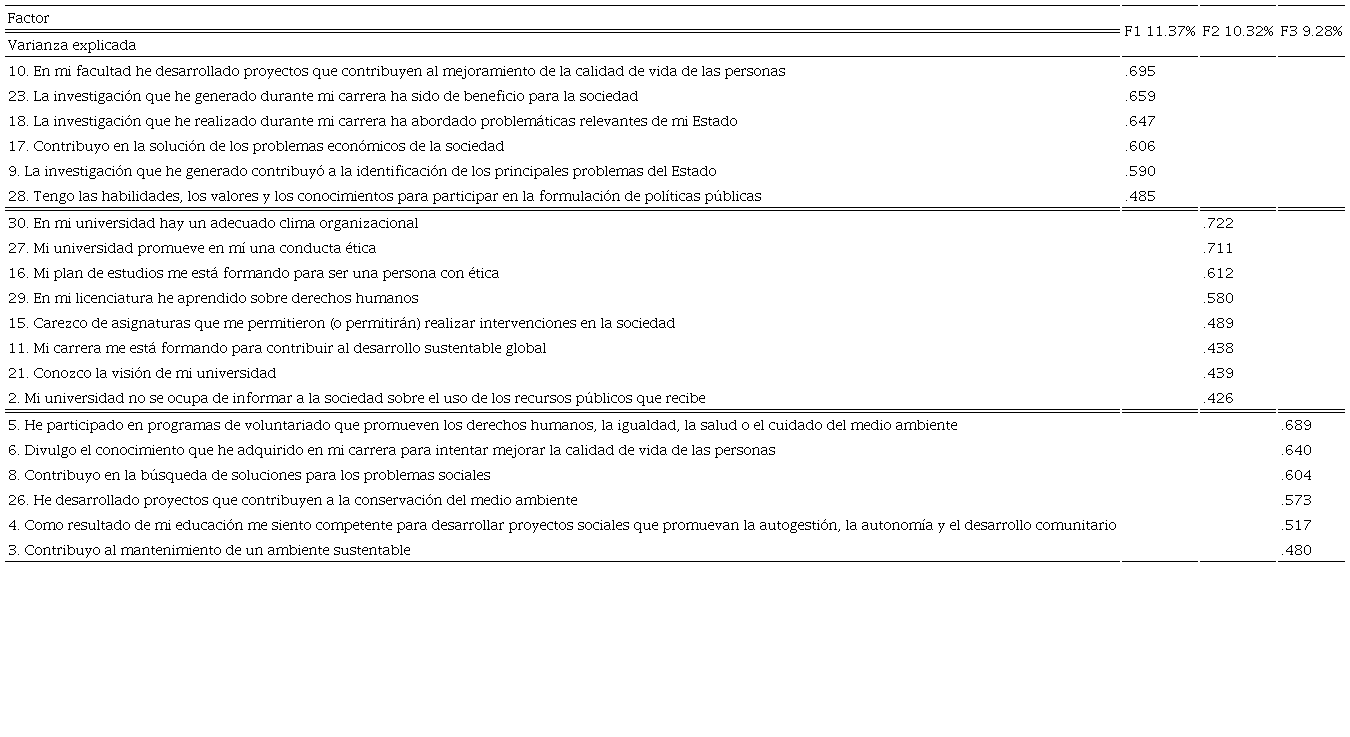 Factor 3. Participación social: se refiere a la capacidad y disposición del universitario para implementar soluciones de problemáticas de su entorno en beneficio de la sociedad. Este último factor está formado por seis reactivos (ver Tabla 3).