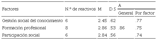 Igualmente, los análisis psicométricos realizados en la escala revelaron índices adecuados de confiabilidad para la escala global (.86), lo cual, para diversos autores (Nunnally, 1987; Hernández Sampieri et al., 2014), refleja un índice adecuado de consistencia interna. Los tres factores que conformaron la escala reportaron alfas entre .74 y .77 (participación social .74, formación profesional .75 y gestión social del conocimiento .77), lo que indica índices aceptables de confiabilidad entre los factores (Garson, 2013, en Hernández Sampieri et al., 2014).