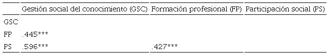 Una vez comprobada la distribución normal de los datos, se procedió con la fase 3. En esta participaron los 500 individuos de la fase dos, cuyas respuestas al instrumento ya estaban capturadas en la base de datos. Se tuvo como objetivo conocer si los factores de la escala se relacionaban entre sí en forma congruente. Para tal fin, se llevó a cabo un análisis de correlación producto-momento de Pearson (Hernández Sampieri et al., 2014; Pick y López, 1994) a través del cual se evidenciaron correlaciones moderadas, positivas y estadísticamente significativas entre los factores. Se observa que, a mayor formación profesional, mayor gestión social del conocimiento (r = .445, p = .001) y mayor participación social (r = .427, p = .001). De igual forma, a mayor gestión social del conocimiento, mayor participación social (r = .596, p = .001) (ver Tabla 6).