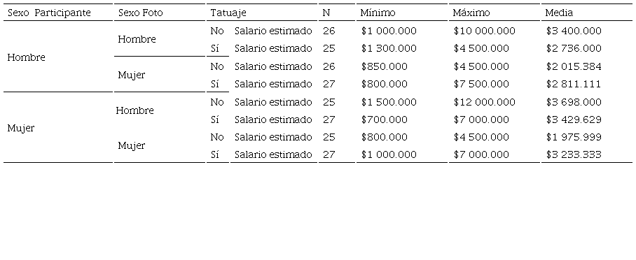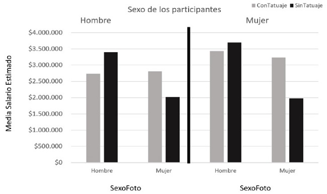 Se evidencia entonces que, tanto mujeres como hombres, dan mayor atribución económica al hombre sin tatuajes que al hombre con tatuaje; mientras que lo contrario pasa con la atribución económica que, tanto mujeres como hombres, sugieren a la mujer con tatuajes frente a la mujer sin tatuajes, dando una atribución económica mayor cuando la mujer está tatuada que cuando no lo está. Es importante resaltar que el comportamiento de la variable salario es indiferente al sexo del participante, puesto que las atribuciones económicas sugeridas por los participantes se asemejan sin encontrar discrepancias importantes. Para finalizar, es importante recalcar que hay una diferencia significativa en la percepción de la retribución económica que se les da a las personas cuando estas tienen tatuajes y que para este caso influye de diferente forma según el sexo.