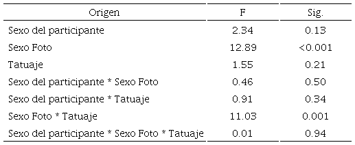 Para el análisis estadístico se usó el modelo de ANOVA factorial 2X2X2 de medidas independientes, que consiste en analizar la varianza de un factor y los posibles efectos (de interacción o independencia) que surgen a partir de la relación entre variables (Shankar- Srivastava, 2014). Para esta comparación se utilizaron tres grandes dimensiones: el sexo de la persona de la imagen, el uso de tatuajes o no y el sexo del participante. Estas tres dimensiones se compararon con la percepción de atribución salarial generada. Al utilizar el ANOVA, se busca identificar cuál de estos tres factores, independientemente o en conjunto, es lo que afecta la percepción de atribución salarial.