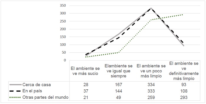 Acorde con los objetivos del estudio -y en el orden que fue creado el cuestionario-, se presenta primero la percepción de la calidad del ambiente. En la Figura 1 se muestra la respuesta para cada contexto espacial y por cada opción de respuesta; la mediana para los tres reactivos fue la misma (Med = 3). Sin embargo, se puede apreciar que cerca de casa y en el país la distribución de respuestas es muy similar, cuya frecuencia más alta indica que se percibe el ambiente un poco más limpio, para después decaer en la última opción de respuesta, mientras que en otras partes del mundo la distribución es ascendente, de manera que la frecuencia más alta es para la percepción de que el ambiente se ve definitivamente más limpio.