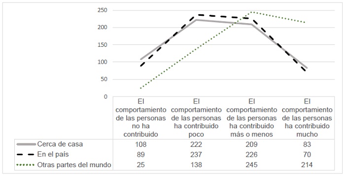 A continuación, se solicitó evaluar qué tanto contribuyen las personas a la condición en la que se encontraba el ambiente en ese momento. Para el entorno cercano y en el país, se obtuvo una mediana de 2, que indica que las acciones de las personas contribuyen poco, mientras que en otras partes del mundo la mediana fue de 3, es decir, que el comportamiento de las personas contribuye más o menos. En la Figura 2, se aprecia nuevamente una distribución similar para el contexto cercano a casa y en el país, con una mayor frecuencia en las opciones intermedias, en tanto que se evalúa mejor la contribución de las personas en otras partes del mundo.