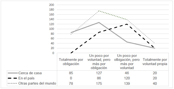 Para complementar la evaluación que se hace del comportamiento de las otras personas, se midió si consideraban que era por voluntad propia u obligación en los casos donde se percibía una alta contribución al ambiente. En estas preguntas hubo varios datos perdidos, pero se decidió no utilizar ningún método para sustituir estos datos perdidos, ya que los reactivos se consideraban individualmente, por lo que los métodos que utilizan los valores circundantes podrían dar puntajes más alejados de la valoración. En el caso del entorno cercano (14 datos perdidos), la mediana fue igual a 2, es decir, que los participantes consideran que a nivel local las personas que más han contribuido lo han hecho “un poco por voluntad, pero más por obligación”; a nivel país (70 datos perdidos), con mediana igual a 3, se considera que las personas que contribuyeron lo hicieron “un poco por obligación, pero más voluntad”. Mientras que para las personas en otras partes del mundo (27 datos perdidos), la mediana fue igual a 2. Aunque este dato es igual que a nivel local, puede notarse en la distribución general que las personas de otras partes del mundo fueron mejor evaluadas respecto al grado de voluntad para contribuir al ambiente (ver Figura 3).