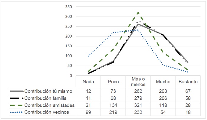 Para un mayor discernimiento sobre lo que ocurre en el contexto cercano de los participantes, así como la inclusión de su propia aportación, se evaluó el grado de contribución al cuidado del ambiente de: sí mismo, su familia, sus amistades y sus vecinos. En la Figura 4 se observa que la evaluación de la participación propia y de familiares es muy parecida y, aunque en menor medida, la de los amigos, mientras que la evaluación a los vecinos se nota diferente; de hecho, la mediana para la participación propia, de familiares y amigos fue la misma (Med = 3), que es la opción intermedia “más o menos”, en tanto que para los vecinos la mediana fue 2, que equivale a la respuesta “poco”.
