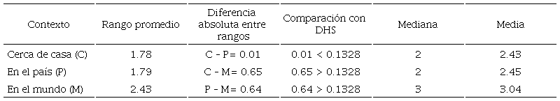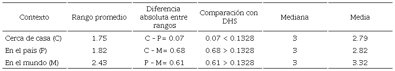 La prueba de Friedman mostró una diferencia estadísticamente significativa entre los tres contextos [X2 (2) = 304.156, p=.000]. Se procedió a aplicar la prueba post hoc de Nemenyi y se presenta la fórmula con los valores que sustituyen cada término (2). La DHS fue igual a 0.1328. En la Tabla 1 se aprecia que para la percepción de otras partes del mundo las diferencias absolutas entre rangos son mayores que la DHS, por lo cual son significativamente diferentes y la media permite ver que la percepción de la calidad del ambiente en el mundo fue más alta, lo que apoya la hipótesis 1 (aunque la medida adecuada es la mediana, en este caso se agregó la media porque permitió notar mejor la diferencia entre respuestas).