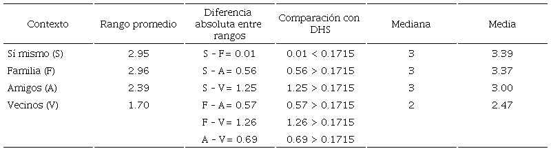 Se observaron diferencias estadísticamente significativas entre los actores evaluados [X2(3) = 705.877, p = .000]. La prueba de Nemenyi se calculó ahora para k = 4, dando el valor de DHS = 0.1715. La Tabla 3 señala que, con excepción de la diferencia entre la evaluación propia y de la familia, todas las comparaciones fueron estadísticamente significativas. La media y la mediana indican que, como ya se había observado en la Figura 4, los vecinos tuvieron la evaluación más baja. Esto apoya la hipótesis cuatro.