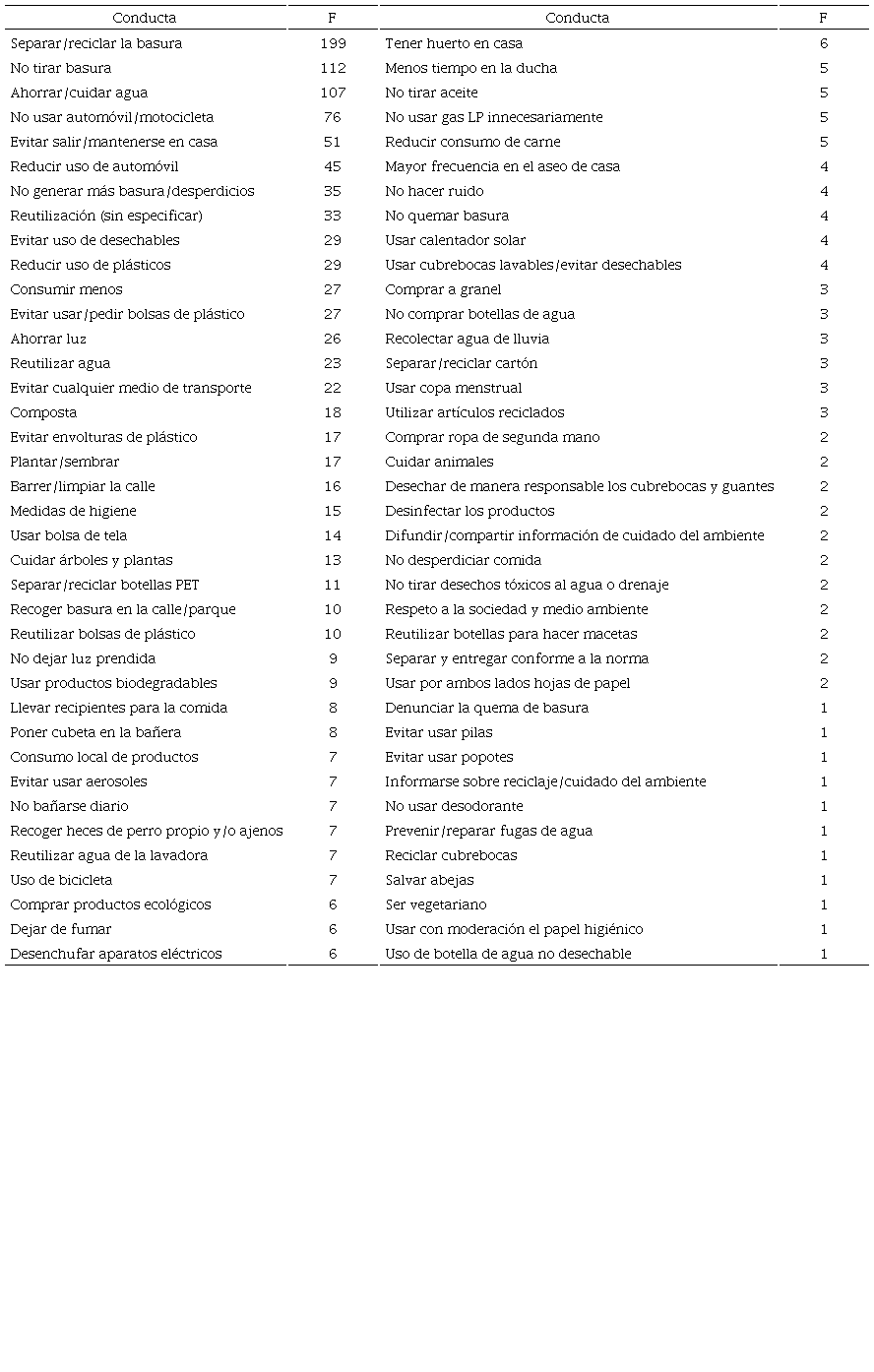 Por último, se describen las conductas proambientales autorreportadas de los participantes en ese lapso. Se leyeron todas las respuestas y se consideraron 76 conductas diferentes (si bien, algunas podrían considerarse semejantes). La Tabla 4 presenta las conductas ordenadas por la frecuencia de respuesta. Se puede observar que las dos acciones más mencionadas son referidas a los desechos: separarlos y evitar tirarlos al suelo; las que están relacionadas con la reducción de la movilidad, aparecen en el cuarto, quinto y sexto lugar. Se destaca que algunas de las acciones nombradas no son proambientales, sino referidas a las medidas de cuidado para la prevención de contagio: medidas de higiene, mayor frecuencia de aseo, desinfectar los productos; así como también acciones que sí son proambientales y están relacionadas con la nueva problemática de desechos, como usar cubrebocas lavables o desechar de forma responsable los desechables, aunque estas conductas tuvieron una baja frecuencia.