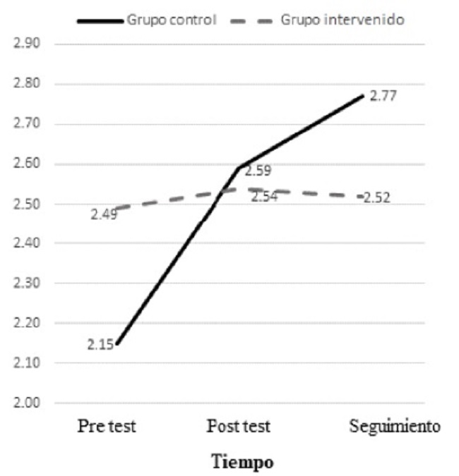 En la Figura 1, se observa que en el grupo control se incrementa el valor de las medias de auto atribución negativa, es decir, dichos auto atributos se incrementan con el tiempo. Por el contrario, el efecto sobre el grupo intervenido se mantiene, mostrando un ligero incremento en las medidas de postest y una disminución en el seguimiento.
