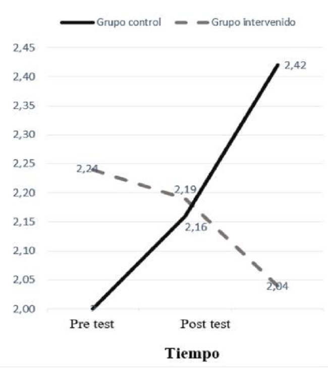 Con respecto a los afectos, la Figura 2 muestra que en el grupo intervenido disminuye el valor de las medias de afecto negativo, a diferencia del grupo control donde se observa que hay un incremento en las medias de dicha variable, es decir, se incrementa el afecto negativo.