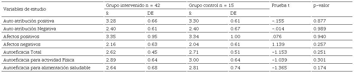 La distribución de las variables de estudio se obtuvo mediante los estadísticos de asimetría y curtosis, cuyos resultados muestran que el total de las variables, tanto en el pretest como en el postest, cumplen el criterio de normalidad (< 3) (Ho y Yu, 2015). A partir de lo anterior, se aplicó la prueba t de Student para muestras independientes, con el propósito de conocer la equivalencia inicial entre los grupos (intervenido y control). En los resultados no se encontraron diferencias significativas en las variables de estudio: auto atributos positivos, auto atributos negativos, afectos positivos, afectos negativos, autoeficacia global, autoeficacia para actividad física y autoeficacia para una alimentación saludable (Ver Tabla 1).