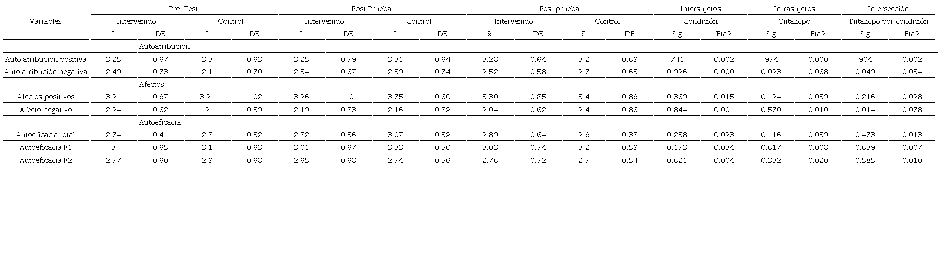 Se aplicó el ANOVA MR para alcanzar el objetivo de esta investigación, el factor inter-sujetos fue la condición experimental (intervenido o control) y los factores intra-sujetos fueron las variables de estudio, en sus tres mediciones en el tiempo (pretest, postest y seguimiento). Los resultados se interpretaron con el estadístico Greenhouse-Geisser debido a que, en todos los casos, la prueba de esfericidad W de Mauchly no fue significativa (p > .05) (Field, 2013). En la Tabla 2 se observan los resultados significativos, específicamente, en la variable de autoatribución negativa en los factores intra-sujetos y en la interacción tiempo por condición. Así, también se observaron resultados significativos en la intersección tiempo por condición para la variable afecto negativo. En todos los casos la magnitud del efecto (eta2) fue mediano.