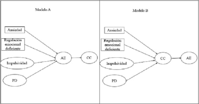 Si bien existen estudios como los anteriormente expuestos, el conocimiento de las variables psicológicas que explican la conducta alimentaria emocional es aún incipiente, particularmente en lo concerniente a la influencia de las variables psicológicas ya mencionadas (ansiedad, la regulación emocional deficiente, la impulsividad y el perfeccionismo desadaptativo), tanto de manera independiente como conjunta en la AE. Surge, además, la necesidad de reducir la brecha de la falta de consenso entre el conocimiento teórico y empírico del rol que juega la composición corporal (CC) en los modelos explicativos de la alimentación emocional, así como sobre las variables psicológicas que explican este tipo de ingesta desregulada. Respecto al primer punto, si bien la AE ha sido principalmente probada en modelos empíricos como una variable mediadora entre factores de ajuste psicológico y la CC (ver Figura 1, modelo A), a nivel teórico, la teoría psicosomática de la obesidad (Kaplan y Kaplan, 1957) -retomada en muchas de las investigaciones-, plantea que la CC funge como mediadora entre los aspectos psicológicos y la AE, pese a lo cual, solo unos cuantos estudios empíricos han intentado probar dicho ordenamiento de las variables (ver Figura 1, modelo B). En consecuencia, este estudio tuvo como objetivo analizar los efectos en modelos empíricos de variables psicológicas (ansiedad, regulación emocional deficiente, impulsividad y perfeccionismo desadaptativo) sobre la alimentación emocional (por medio de los factores de ineficacia y desconfianza en la conducta alimentaria emocional) y la composición corporal de estudiantes universitarios en los dos ordenamientos hipotetizados.
