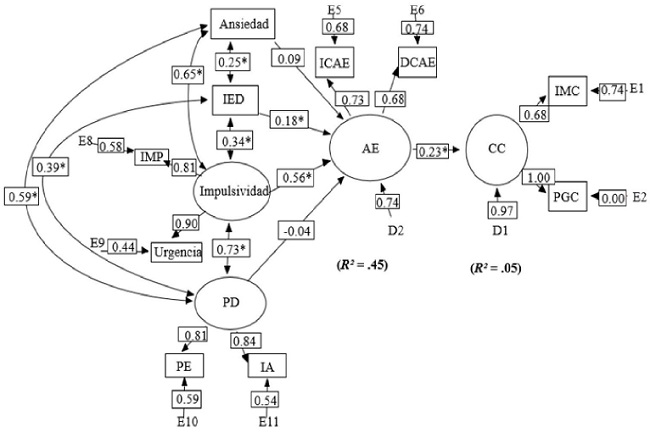 De acuerdo con la versión final del modelo con la muestra de las y los estudiantes universitarios (ver Figura 2), el factor psicológico tuvo un efecto causal del 45 % en la ingesta emocional, mientras que este tipo de ingesta explicó el 5 % de la composición corporal adicional. En tanto al análisis de senderos significativos en el modelo, se encontró que la regulación emocional deficiente y la impulsividad predijeron una mayor CC (β = .23, p < .05). De esta manera, se puede apreciar que una mayor deficiencia en la regulación emocional -asociada con mayores niveles de ansiedad y perfeccionismo desadaptativo- tiene un efecto conjunto sobre una mayor alimentación emocional (β = .18, p < .05), así como una mayor impulsividad -relacionadas a mayores puntajes de ansiedad y perfeccionismo desadaptativo- representa un efecto significativo en este tipo de ingesta, e incluso, en mayor medida que la regulación emocional deficiente (β = .56, p < .05).