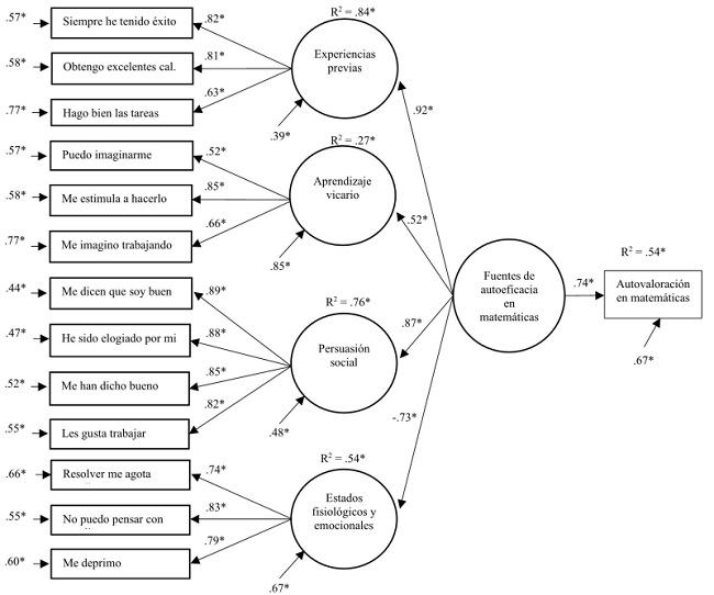 Tal como se propuso en el modelo teórico, se formaron cuatros factores de primer orden, uno destinado a cada fuente de información: experiencias previas en matemáticas (integrado por 3 reactivos), aprendizaje vicario (conformado por 3 reactivos), persuasión social (compuesto por 4 reactivos) y estados fisiológicos y/o emocionales (formado por 3 reactivos); los 4 factores constituyen la variable latente de segundo orden denominada fuentes de información de autoeficacia en matemáticas. De los cuatro factores, solamente el factor estados fisiológicos y/o emocionales mostró una relación negativa (peso factorial de -0.73), como se esperaba según la propuesta teórica. El factor de segundo orden fuentes de información de autoeficacia ejerce un efecto directo y positivo (peso estructural de 0.74) sobre la autovaloración en matemáticas. En el modelo probado, la autovaloración en matemáticas posee una R2 igual a 0.54, esto significa que el modelo de relaciones explica el 54 % de la variabilidad de la autovaloración en matemáticas realizada por los universitarios, como fue medido en este estudio.