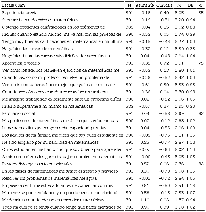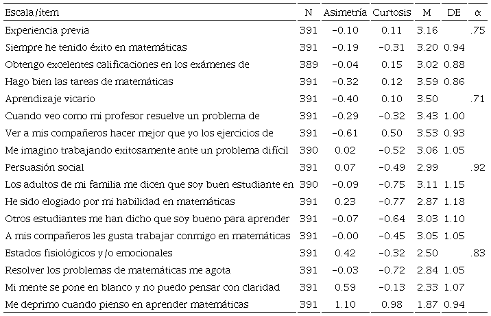 La Tabla 1 presenta los resultados descriptivos y de consistencia interna para las subescalas que conforman la escala de fuentes de información de autoeficacia en matemáticas. Los resultados de la subescala experiencias previas de los estudiantes en el área de matemáticas arrojan una media de 3.05 (en una escala de 1 a 5); esto es, indica que los alumnos reportan experiencias positivas de forma regular. La escala mostró que los datos recabados en cada ítem se distribuyeron normalmente, con valores de entre -2 y 2 de acuerdo con Pérez López (2004), y reflejó una consistencia interna adecuada (alfa de 0.65).