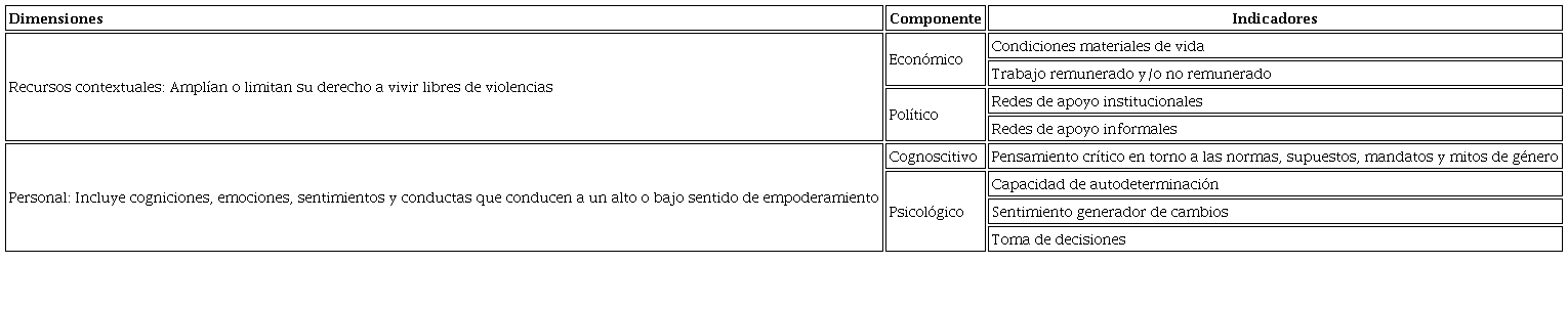 El empoderamiento va desde lo individual hasta lo colectivo (Rowlands, 1997) y, de acuerdo con Stromquist (1997), abarca las dimensiones cognoscitiva, psicológica, económica y política. La primera alude a la comprensión de las mujeres sobre las condiciones de subordinación, los conocimientos sobre la sexualidad y sus derechos humanos y legales, y de los patrones comportamentales que crean dependencia, interdependencia y autonomía en la familia y sociedad. La dimensión psicológica apunta al desarrollo de habilidades, estrategias y acciones que las mujeres ponen en práctica, individual y socialmente, para mejorar su condición. En cuanto a las dimensiones cognoscitiva y psicológica, desde el campo de la psicología cognoscitiva-motivacional, Deci y Ryan (2000) indican que algunos contextos brindan a las personas condiciones para potenciar su autodeterminación, mientras que otros obstaculizan la satisfacción de sus necesidades y entorpecen el desarrollo de procesos cognoscitivos, emocionales, conductuales y relacionales. Lo descrito es importante en los procesos de empoderamiento, ya que estos demandan la emergencia de una conciencia crítica que dé pie a vías alternas de ser o hacer, de modo que las proposiciones culturales pierden su carácter normalizado. Implican, además, el cuestionamiento de normas sociales, el establecimiento de valores, preferencias y acciones que desafíen a las mismas (Kabeer, 1997). Para la emergencia y/o desarrollo de los elementos señalados, se necesitan condiciones materiales, es decir, recursos económicos y políticos (Stromquist, 1997). Los primeros comprenden la capacidad de compromiso de las mujeres con una actividad productiva que les brinde un grado de autonomía financiera. Por su parte, el componente político demanda condiciones facilitadas por el Estado e instituciones sociales que permitan estos cambios.