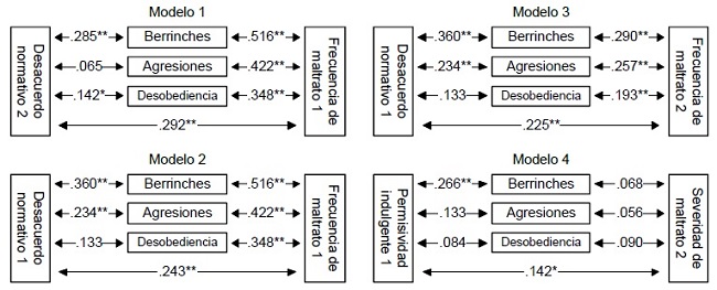 Se puso a prueba el modelo de efectos mediadores entre las cuatro correlaciones positivas y significativas anteriores, pero solo si se identificó que al menos una de las variables mediadoras (conductas problemáticas) establece simultáneamente correlaciones significativas con la variable exógena (permisividad) y con la variable endógena (maltrato), estableciendo así el puente para la influencia indirecta. Para evaluar este criterio se elaboran cuatro modelos (figura 1), pero el modelo numero 4 (entre permisividad indulgente del cuidador 1 y la severidad de maltrato del cuidador 2) no cumple el requisito recién descrito, mientras los primeros tres modelos avanzan a un modelamiento de ecuaciones estructurales.