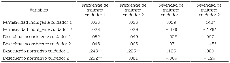 De las 24 correlaciones calculadas entre las variables de permisividad y las variables de maltrato, seis de ellas son significativas (25 %), pero solo cuatro de ellas poseen el signo positivo de nuestra hipótesis (16 %), como se observa en la Tabla 1, asociando la variable permisividad indulgente con severidad de maltrato, y la variable desacuerdo normativo con frecuencia de maltrato.