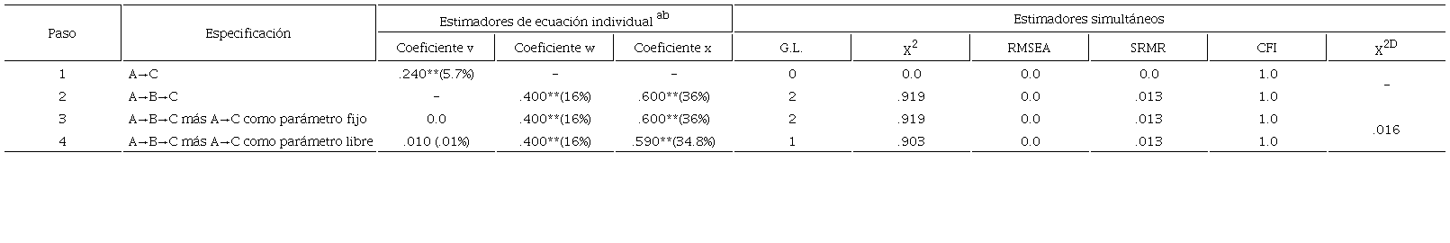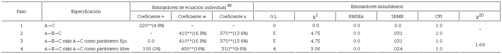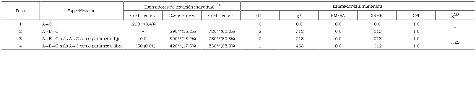 En este modelo, los coeficientes de las trayectorias v, w, x en los pasos 1 y 2, para estimar la asociación entre las tres variables, son todos significativos en la dirección predicha. En el paso 1, el efecto de la variable independiente sobre la variable dependiente; esto es, el efecto de A sobre C, es .290; p = .01. Y, en el paso 4, controlando la variable mediadora, el coeficiente de la misma trayectoria se reduce a -.050, perdiendo también toda significancia estadística, por lo que el efecto de A sobre C es puramente indirecto. Los estimadores simultáneos muestran valores de ajuste global adecuados en los 4 pasos: X2 es consistentemente menor que los grados de libertad; RMSEA muestra en todos los pasos un valor de ajuste perfecto; SRMR también muestra solo valores bajos; CFI muestra solo valores de ajuste perfecto. También, se cumple la condición de una mejoría mínima en el grado de ajuste del modelo completo en el paso 4, cuando la trayectoria v se libera, respecto al paso 3, cuando v se encuentra como parámetro fijo en cero, ya que X2 pasa de .718 (con 2 grados de libertad) a .468 (con 1 grado de libertad) con un diferencial de 0.25.