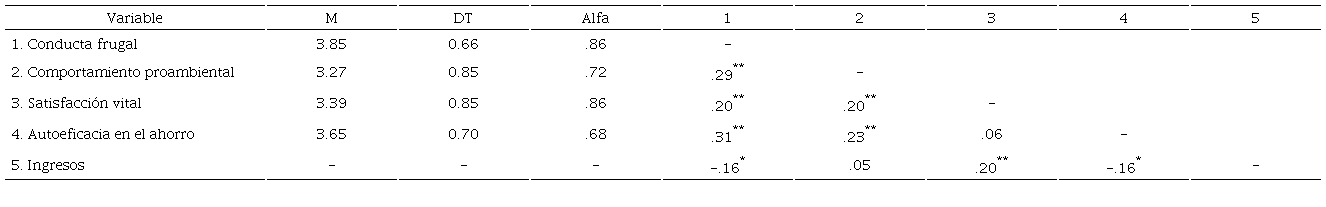 Se obtuvieron alfas de Cronbach para estimar la confiabilidad de las escalas utilizadas, ya que todas tenían una estructura conceptualmente unidimensional. Posteriormente, se efectuaron análisis univariados (medias y desviaciones) para todas las variables analizadas. A continuación, se realizaron análisis de correlación bivariada y de regresión lineal para poner a prueba las hipótesis planteadas. Por último, se realizó un ANOVA en el que se usaron los ingresos familiares mensuales como variable independiente y, como variables dependientes, la conducta frugal y la satisfacción vital.