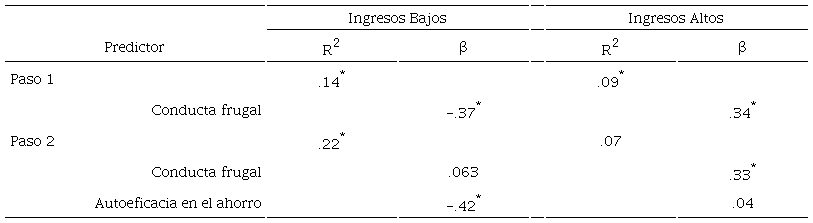 Se observó que la variable que más contribuye a la predicción de la conducta frugal es la autoeficacia en el ahorro (β = .32; p < .01), seguida de la satisfacción vital (β = .19; p < .01) y de los ingresos económicos (β = -.16; p < .05), aunque estos en sentido negativo. En total, estas tres variables explican un 17 % de la varianza de conducta frugal.