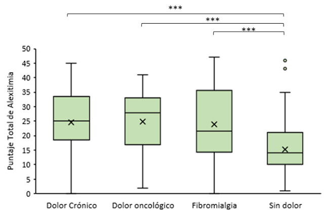 Al analizar el puntaje total de la escala de alexitimia, se encontró que el grupo de dolor crónico presentó una M = 24.67 (DE = 9.82) puntos; el grupo de dolor oncológico una M = 24.73 (DE = 11) puntos; y el grupo de fibromialgia una M = 23.84 (DE = 13.42) puntos, ubicando a los primeros tres grupos en el nivel clínicamente alto de alexitimia; mientas que el grupo libre de dolor crónico una M = 16.56 (DE = 8.99) puntos, ubicados en un nivel clínicamente moderado. Se encontró una diferencia significativa principal por tipo de grupo (H [3] = 39.3, p < 0.001), con un tamaño del efecto ER2 = 0.184.