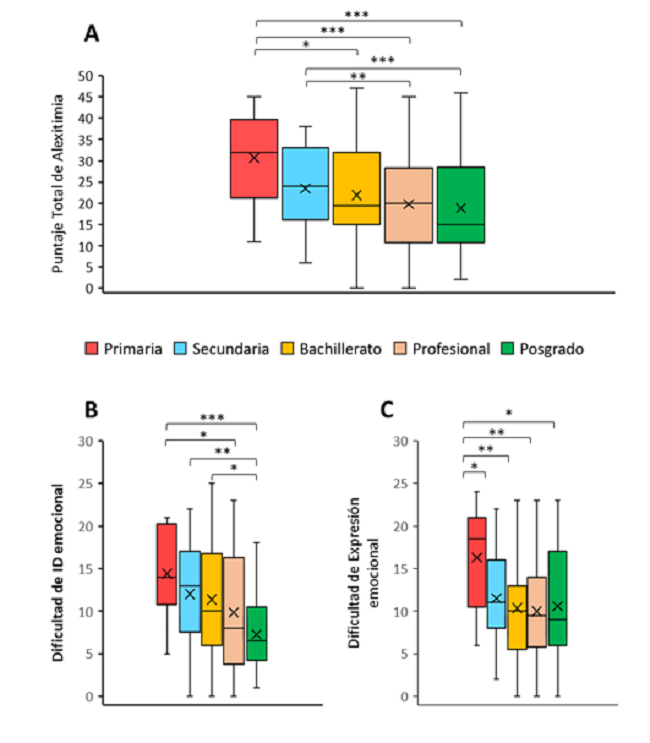 Las comparaciones múltiples de F2 del puntaje de alexitimia hallaron diferencias significativas entre las puntaciones de personas con primaria y secundaria (p = 0.020), entre personas con primaria y personas con bachillerato (p = 0.005), personas con primaria y educación profesional (p = 0.007), y personas con primaria y posgrado (p = 0.024) (ver Figura 2C).